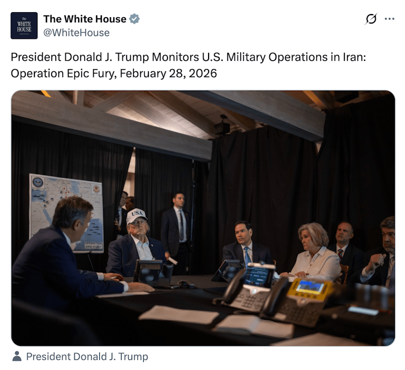 La Casa Bianca ha diffuso su X una foto del presidente degli Stati Uniti Donald Trump e di alcuni dei suoi alti consiglieri che monitorano l’andamento degli attacchi aerei congiunti USA-Israele contro l’Iran. L’immagine mostra Trump, in giacca, camicia bianca e un cappellino da baseball bianco con la scritta “USA”, seduto a un tavolo con il Segretario di Stato americano Marco Rubio e il Capo di Gabinetto della Casa Bianca Susie Wiles, con una mappa parzialmente oscurata contrassegnata “Operation Epic Fury” dietro di loro. Non viene specificato dove sia stata scattata la foto, il post recita solo: “Il Presidente Donald J. Trump monitora le operazioni militari statunitensi in Iran: Operazione Epic Fury, 28 febbraio 2026”. Trump si trova attualmente in Florida. È diventata consuetudine per i presidenti americani diffondere immagini nella situation room in momenti cruciali dei loro mandati alla Casa Bianca. L’ex presidente Barack Obama l’ha fatto quando il leader di Al-Qaeda Osama bin Laden fu ucciso in un’incursione delle forze speciali statunitensi in Pakistan nel 2011. Trump preferisce Mar-a-Lago alla Casa Bianca e lo dimostra anche questa volta, così come avvenuto quando le forze speciali statunitensi catturarono il leader venezuelano Nicolas Maduro a Caracas nel gennaio di quest’anno.